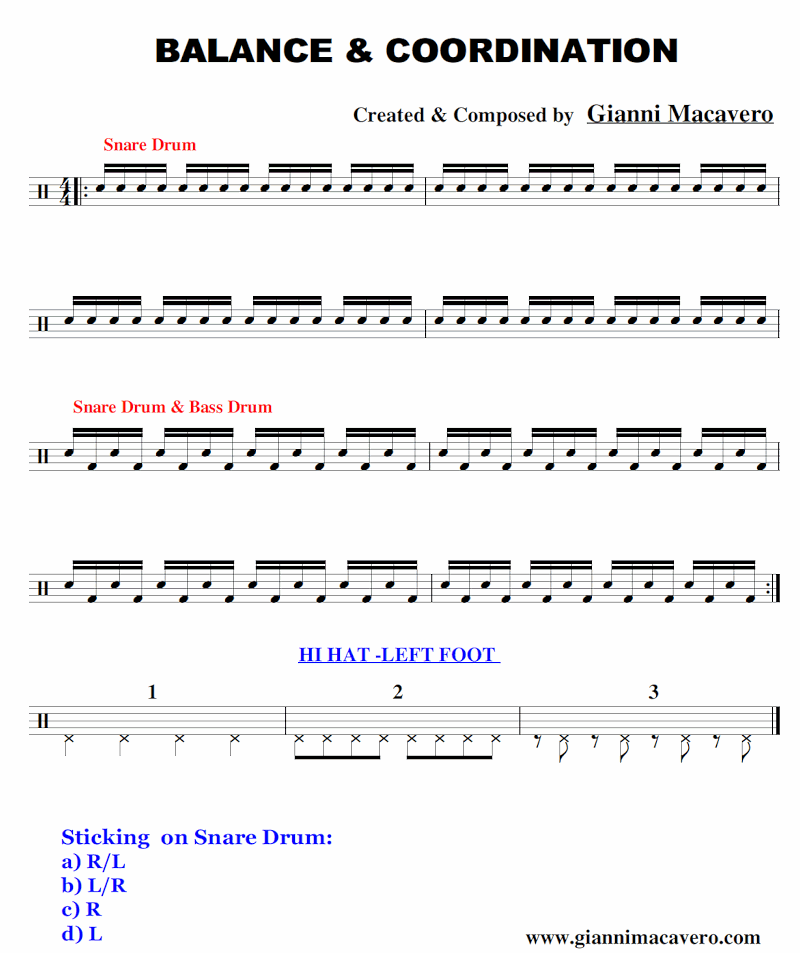 Lo studio diventerà interessante nel momento in cui aggiungerete l’Hi Hat con il Piede Sinistro che scandirá dapprima i Quarti, poi gli Ottavi e infine il Levare di Ottavi.