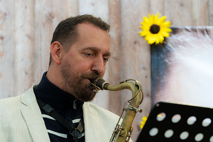 In sostituzione della prevista Fischermanns Orchestra, è arrivata la Brassholes Marching Band di Matthias Schriefl. Il multistrumentista bavarese, accompagnato da un manipolo di fedelissimi, ha suonato davanti al Museo d’arte di Buer, eseguendo brani di sua composizione, e alla Solawi Lindenhof eseguendo dei classici del jazz tradizionale. In questo spazio, una caratteristica fattoria, il pianista tedesco Roman Babik ha portato la sua band, normalmente un quartetto, con l’aggiunta di altri tre fiati. Tutti insieme erano dunque: Martin Giakonovski al contrabbasso, René Creemers alla batteria, Dimitrij Markitantov alto e clarinetto, Ondrej Stveracek tenore, lo statunitense Ryan Carniaux alla tromba, Ognen „Neni” Gjakonovski al trombone. Hanno offerto un concerto strepitoso, una sorta di trascinante jazz balcanico venato di soul, con una front line di fiati travolgente, sia negli insiemi sia negli assolo, e una ritmica davvero centrata, in un set senza interruzioni all’insegna di un groove contagioso, con momenti solistici di alto livello da parte di ciascuno.