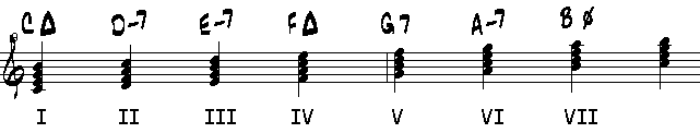 Avete chiarito gli intervalli? Avete ordunque ben compreso la lezione n. 1? Va bene, voglio fidarmi. Vediamo ora di analizzare le relazioni tra gli accordi di una tonalità e la scala generatrice, in questo caso, la scala maggiore. Potremo avere anche un primo, tentennante approccio con la questione dell’improvvisazione.